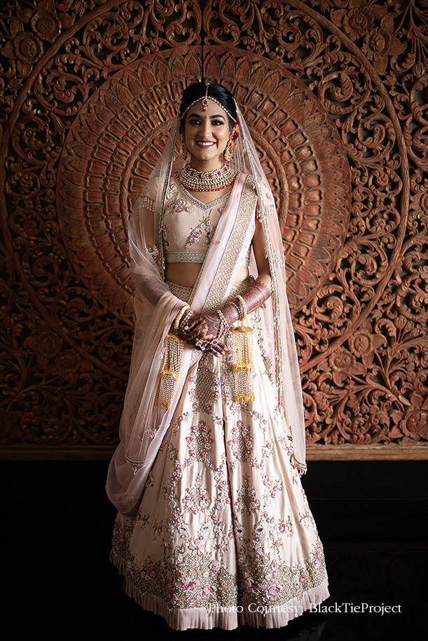 Actress Anushka Sharma‘s dreamy floral and blush pink wedding lehenga set some serious style goals for Sherina. For her outdoor day wedding, she chose a primrose pink lehenga from Christina WT in Shahpur Jat, which featured dainty floral and pearl accents, a pleated hem and crystal tassels on the sleeves. She teamed her outfit with a polki jewellery set with fuchsia crystals that added a pop of colour, and kept her makeup dewy and hair simple. She skipped wearing heavy bangles or the traditional bridal bracelets, and opted only for a diamond tennis bracelet that had simple pearl and gold kaleerein, and her engagement ring.