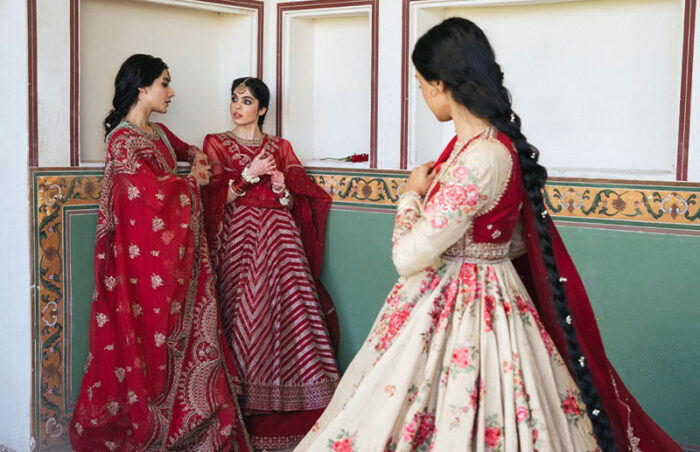 These dreamy options include pastel lehengas with swoon-worthy embellishments, or richly embroidered maharani lehengas in deep hues of crimson or classic reds. Lighter colors and delicate designs work well for functions like an engagement or mehendi, while heavier options can be worn for the sangeet and wedding.