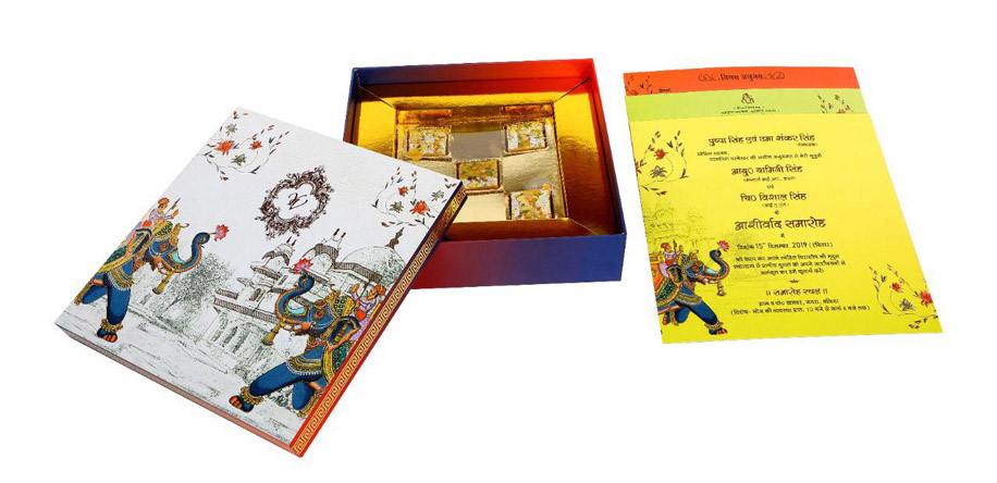 Recalling the experience, she says, “Initially, we were given three different briefs. The most elaborate one was for the most prominent invitees (such as elite guests and politicians) and totaled to 500 invitations. This was followed by simpler designs, one that required 2,000 and the other needing 3,000 invitations. Now, in smaller towns in North India, weddings are a big deal and most include an open invitation; it is an opportunity for the whole town to celebrate. While brainstorming, the couple said that they wanted to do something amazing and give their townspeople an experience they had never had before. From there emerged the ideas of 60,000 invitations, addressed and delivered to each family in the area! We could hardly believe our ears, but this was an opportunity that we did not want to lose.”