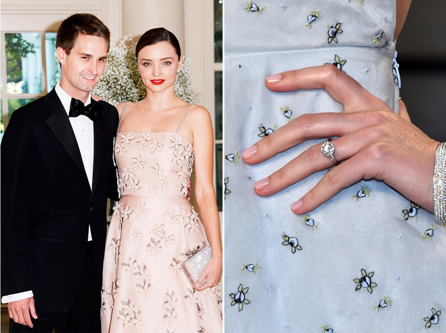 Victoria Secret model Miranda Kerr announced her engagement to Snapchat co-founder and CEO Evan Spiegel through her Instagram with a post that read, “I said yes!!!” Her beau asked her to marry him with a classic ring that showcases a brilliant 4 carat round diamond set in a beautiful platinum mounting with a tapered baguette on each side. The simplicity of the ring is what makes this piece timeless and chic.