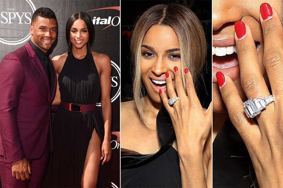 Singer Ciara’s platinum engagement ring holds a brilliant-cut diamond reported to be 16 carats! She and her Seattle Seahawks quarterback boyfriend Russell Wilson announced their engagement through an Instagram video, which he captioned with the words: “She said yes!!! Since day one I knew you were the one. No greater feeling.”