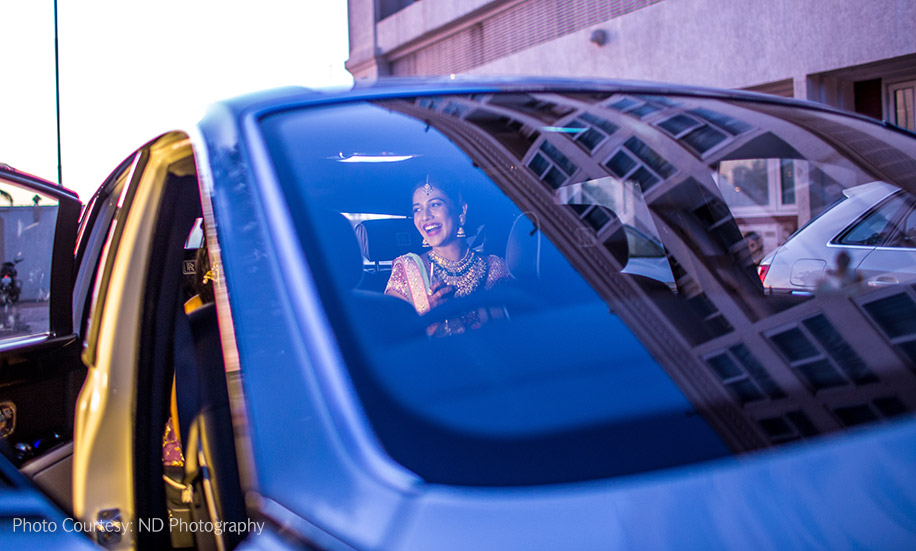 This fun moment happened minutes before the bride reached her sangeet venue. Team ND Photography shares, “We came to the venue where the bride was staying to take shots of her getting ready for the sangeet. We finished the session, and as we start moving towards the main venue, we waited for more than 15 minutes for a vehicle to pick up the bride. She called everybody but there was no response from anyone. Finally the groom surprised her by arriving in a Rolls Royce with champagne to pick her up. She was beyond surprised and beamed with joy and we managed to capture that moment in this picture.”