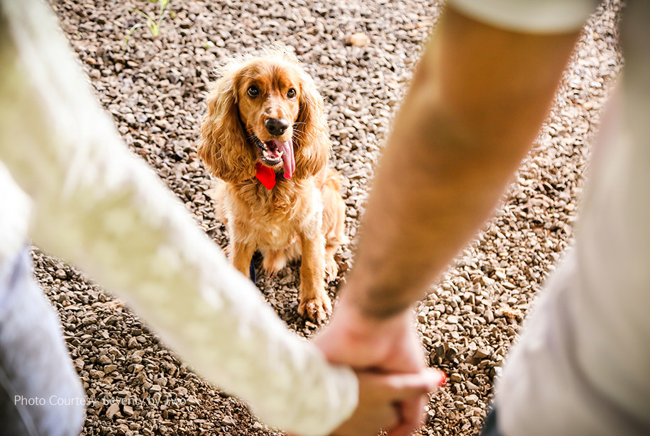 Seventy by Two captured a unique moment of the couple with their furry pet as he looks upon his favorite humans starting a new journey together. “Rio was bride Nisha’s pet and she had since he was a little puppy. When the time came for Rio to be introduced to Nisha’s fiancé Sangeet, the pup must have felt the same emotions as that of a brother or a best friend, knowing that he will have to now share his most favorite human. This particular shot taken during Nisha and Sangeet’s pre-wedding shoot with them holding hands and facing Rio, and he’s looking up to Sangeet – personifies a lot of emotions that you can read through Rio’s expressions,” recalls Team Seventy By Two.