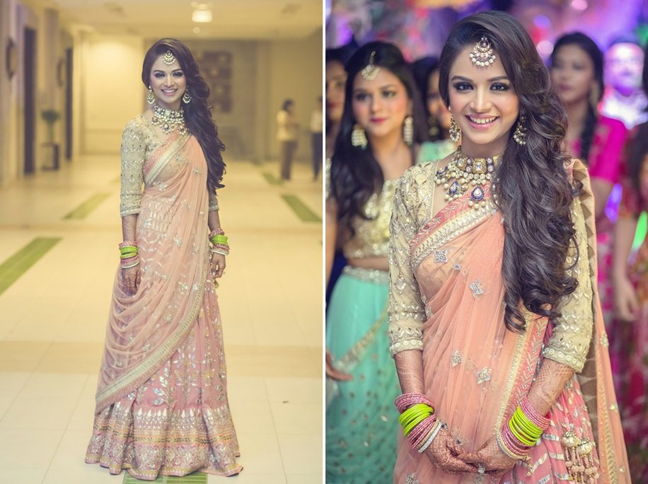 Bride Akanksha chose an Anita Dongre lehenga in coral-tinted blush accentuated with gota patti work for her sangeet in Thailand. She accessorized with Victorian jewellery and added a stylish pop of contrasting green with her bangles.