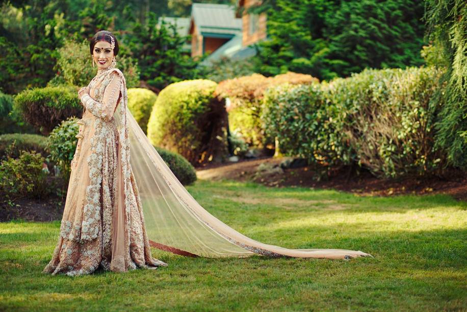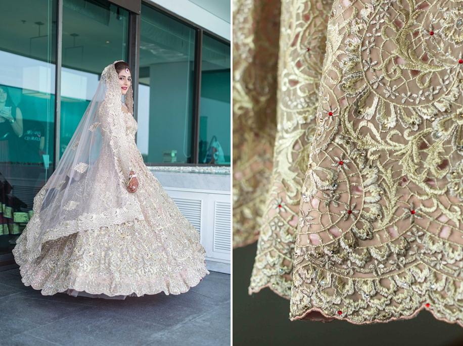 Bride Remina is a study in sophistication with her dreamy blush lehenga with gold and white threadwork and long train by Frontier Raas for her pheras in Canada. Remina accessorized with a kundan set and nathani.
