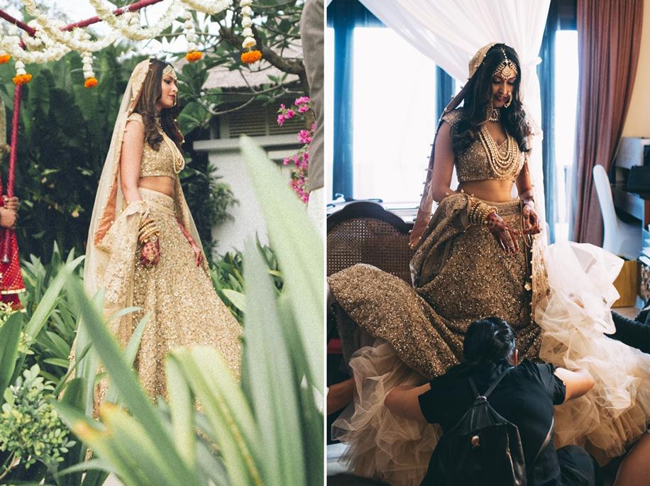Bride Parul opted for vintage elegance in her Sabyasachi Mukherjee lehenga in pale blush with muted gold sequin-work for her pheras in Bali. She accessorized perfectly with an elaborate mathapatti, and nathanai and kundan set.