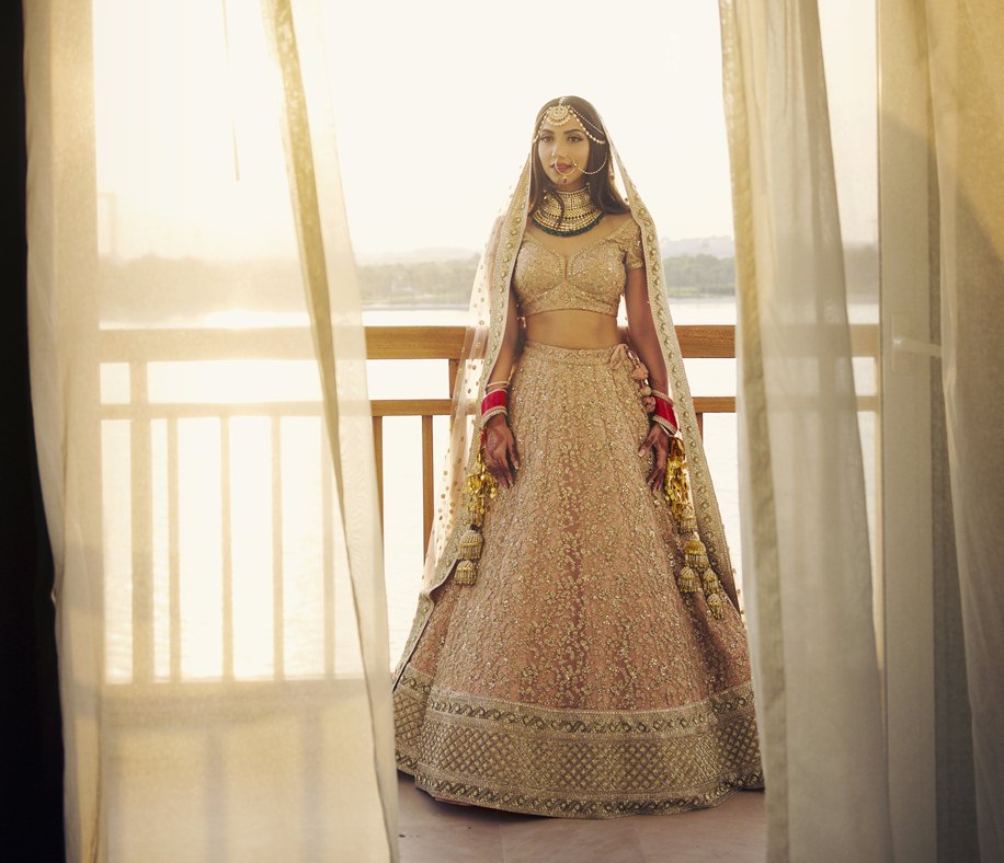 A color that complements the diverse palette of Indian skin tones and is enhanced by all light – whether natural daylight or lamps swaying under a night sky – a blush lehenga makes for the perfect trousseau choice.