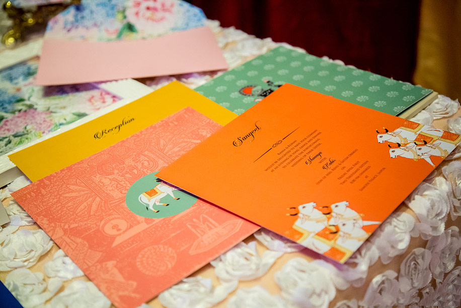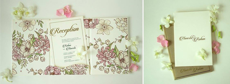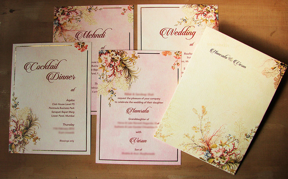 Varun and Namrata wanted different wedding invites for each of their functions. So the designers at Kankotri created a thread to run through them all – floral patterned borders and corners – and then differentiated between cards using subtle pastels that are guaranteed to delight guests.