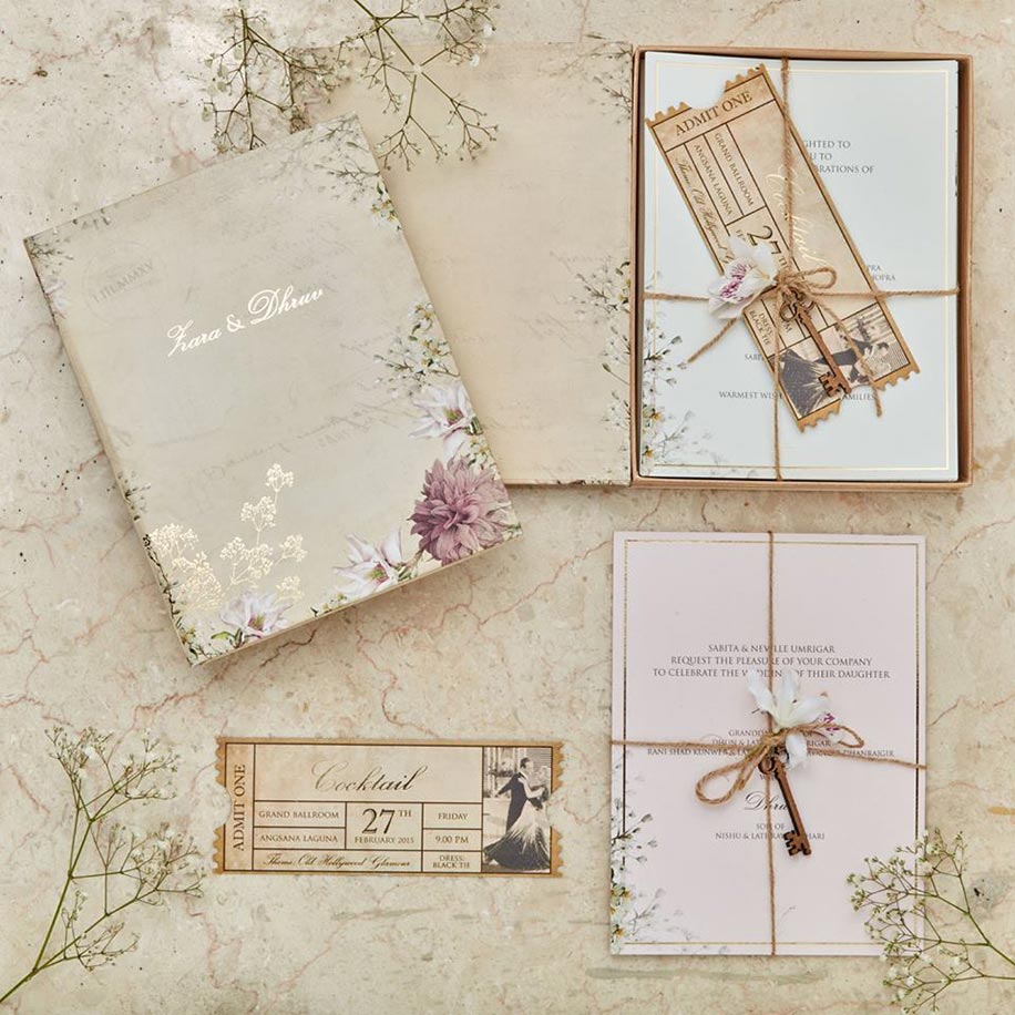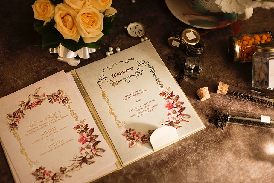 Wedding invitations can be quite linear and information heavy. But this beautifully crafted invite by Ozel Designs looks like a vintage fairytale storybook dedicated to telling a love story. Its delicate floral patterns and muted color scheme spell class and refinement.