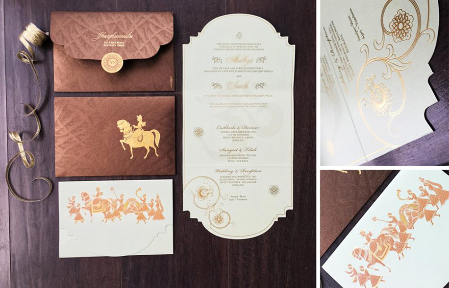 Trust designer Neha Jhunjhunwala of Studio 13, to transform your ideas into a creative accomplishment. Here, she has upgraded the traditional card design and color scheme of burnt sienna, cream and peach, added regal motifs in gold and created a striking invitation!