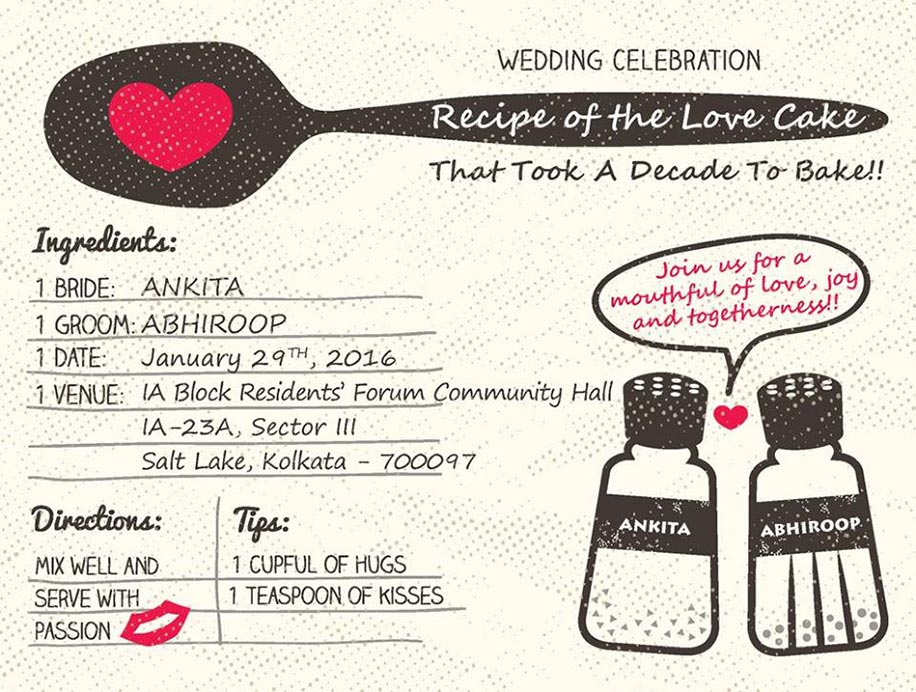 Is it a wedding invite or a gourmet menu card? Artist Aparna Shaw Mehta of Artistic Cloud took Ankita and Abhiroop’s wedding invitation to the next level of cool, by crafting it with a restaurant menu template. The design is clean, friendly and easily makes it to our list of favorites!