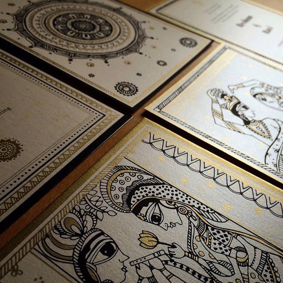 This is the sort of wedding invitation your guests will treasure long after the wedding is over. Kimya Gandhi takes mythological sketches and motifs, rendered them as traditional, Indian folk art and adds an element of surprise with the minimalist color palette of black with piques of gold. Subtle and yet arresting!