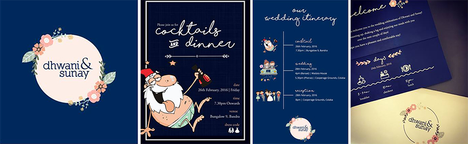 Sakhi Shah’s bar-themed menu wedding invite pleasantly surprised us not only for its unique idea but also its quirky design. The deep blue color palette is constant and there’s a witty play of words, taking quirky to the next level of cool.