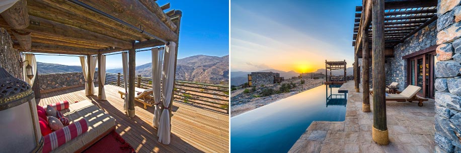 The Alila Jabal Akhdar resort is located in the central section of the Al Hajar Mountains. Jabal Akhdar translates into ‘Green Mountain’ in Arabic and the region is considered the fruit bowl of Oman, with its pomegranate and walnut trees. The resort is built around 2,000 feet above sea level and can be reached in a little over two hours from the Muscat International Airport. The 78-suite resort’s pride of place are its two exclusive Jabal Villas with two bedrooms, ensuite bathrooms, private terrace and pool, dining and living rooms and a nifty kitchenette. Guests are assured serenity, space and stylish living in spaces that have been designed to fit smoothly into the natural rugged terrain of the mountainous area.
