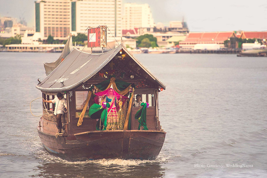 13. If OTT moments are your style, get inspired by Shilpi and Abhay’s Thailand wedding where the bride entered on a boat bedecked with blooms, floating on the resort pool to the mandap while folk dancers performed in the background.