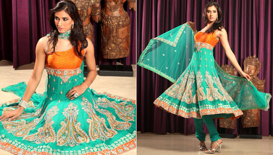Mango and sea green anarkali with antique work