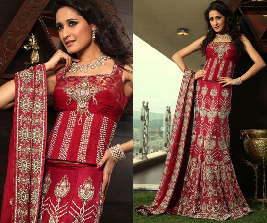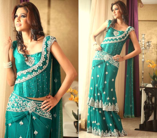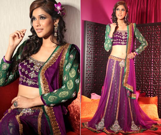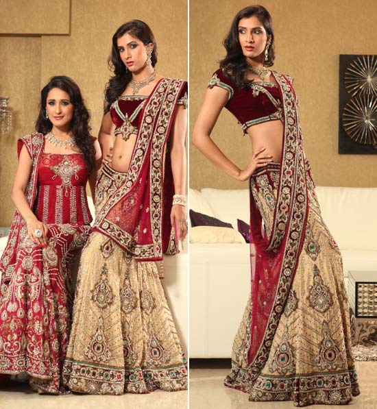 The colors are modern but the styling traditional. Perfect for brides who do not like to go the ‘red’ way, worn with a velvet choli with long brocade sleeves and a net lehenga with a brocade skirt underneath.