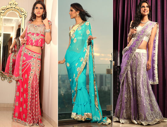 This fusion chiffon saree has a pre-stitched skirt, the frills give a nice twist to the regular saree and the lumpy border adds to the ruffled look. Nice pick for your best friend’s wedding!