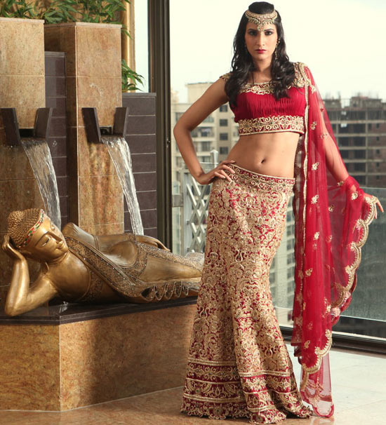 The raw silk bridal lehenga uses the traditional maroon and gold combination. A velvet blouse and net dupatta with velvet border beautifully embellished with zardosi, antique, diamante, silver.