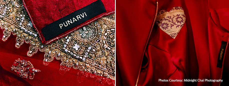 This one will bring tears to your eyes. Punarvi had a very specific vision for her lehenga and she wanted to carry with her, on her big day, the memory of her mother, inside her blouse, close to her heart. So in homage to her, Punarvi made a heart using the fabric from her mother’s wedding saree and had it stitched on the inside of the blouse so it sat atop her’s. Tucked inside, out of sight to the world at large, it added deep significance to her outfit. Guests however got to admire another detail: she developed an intricate pattern including her wedding logo of clocks in the design which was embroidered on the crimson crepe satin fabric of her lehenga.