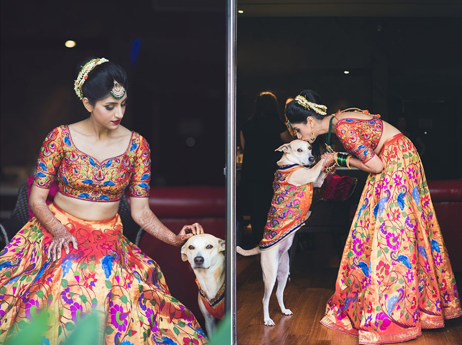The mention of a Maharashtrian style ceremony would conjure up images of a bride in a paithani Nauvari saree. However, for Mitali who was very keen on wearing a lehenga for her wedding, her mother-in-law custom made her a paithani lehenga that went perfectly with her Bajirao Mastani themed ceremony. Not only that, she even had the most charming paithani jacket stitched for Mitali’s dog so that they could twin on her big day!