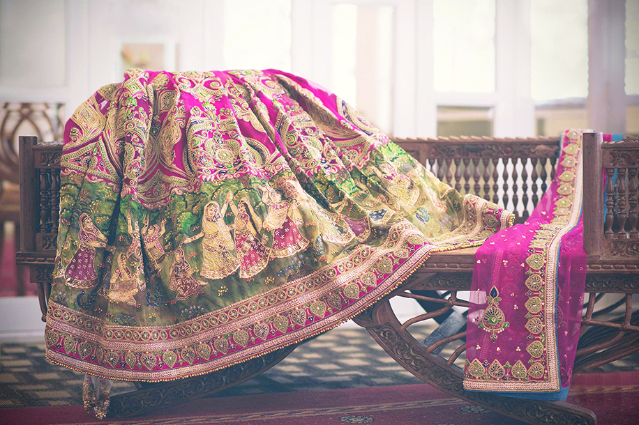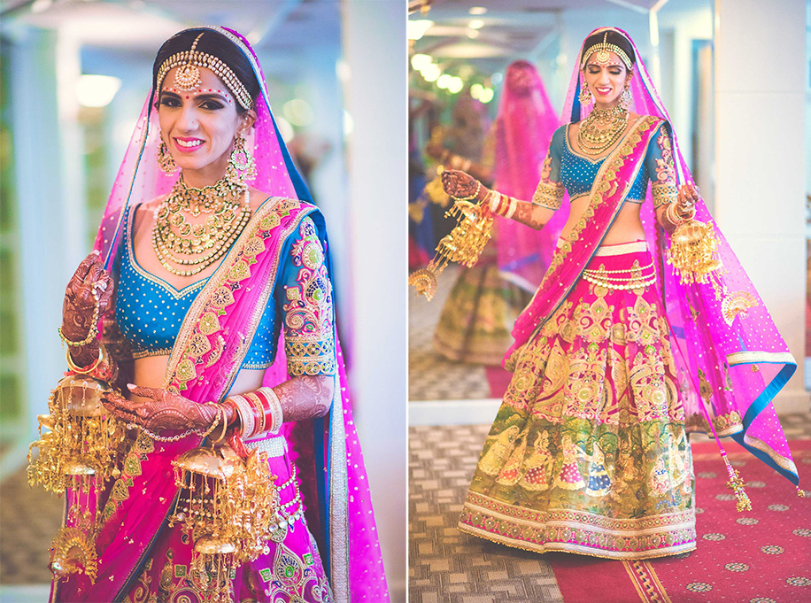 If there is one couple in all of Indian mythology known for their fabled amorous encounters, it is Radha and Krishna. Fashion designer Nishka Lulla took inspiration from their love and let her wedding lehenga become an ode to their bond by creating a ‘Radharani’ theme lehenga for her pheras. The border featured scenes from the gardens of Vrindavan making this one-of-a-kind outfit that evoked a love story from the ancients.