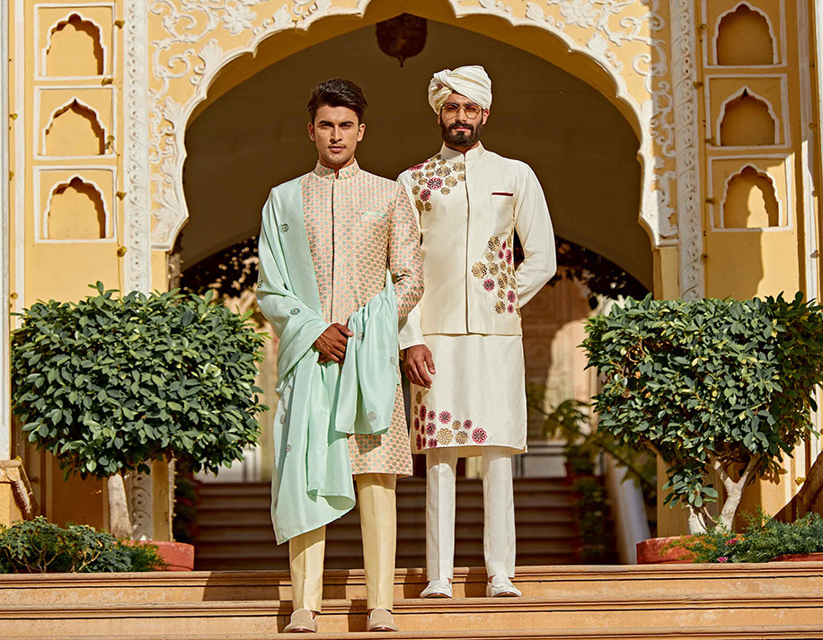 Handcrafted in fine silk, these pieces represent remarkable style. The intricately patterned teal angarkha creates a dramatic contrast to the light kurta and the pants underneath making it an attention grabbing addition to any selection of Indian outfits. The mint green sherwani with its soothing palette is the perfect choice for functions in the warm months of summer or a day event in the winter.