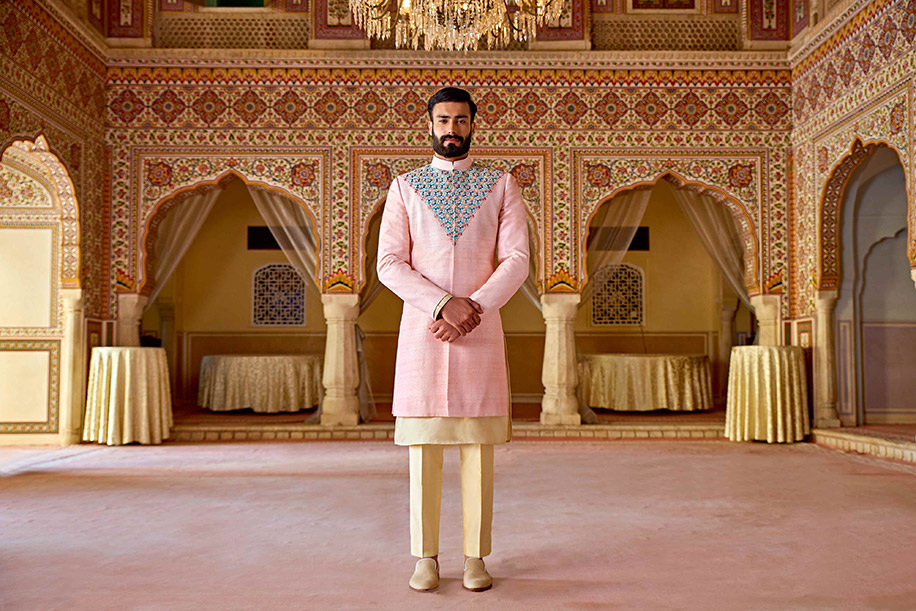 Inspired by the glow on a blushing bride, this pale pink sherwani is unabashed luxury in every detail. Contrasting teal threads weave intricate patterns in the kurta while complementing beige close fitted pants complete the look for an elevated ethnic style.