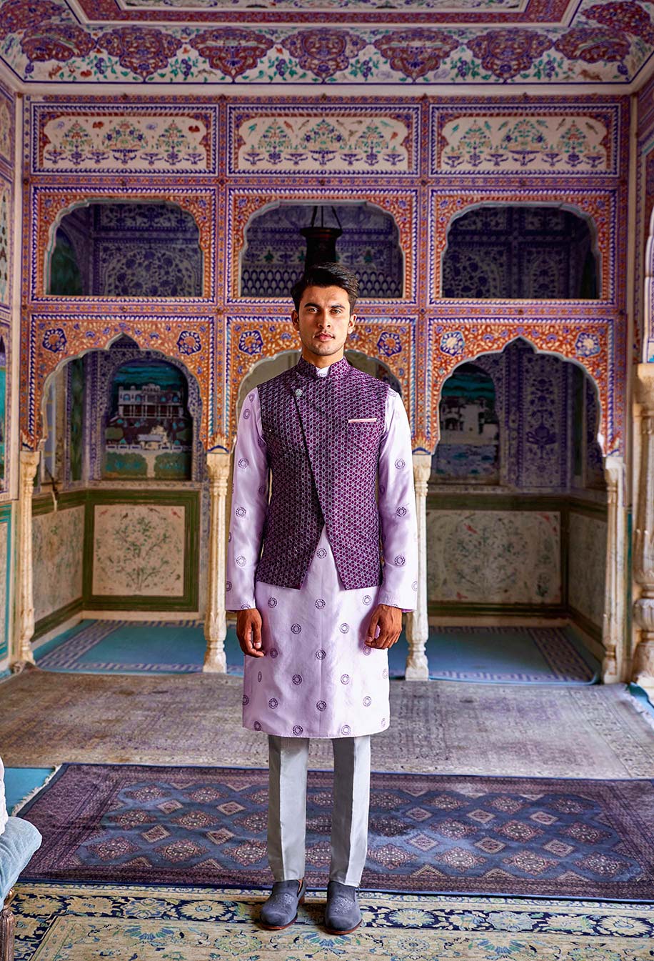 Complex embroidery on the deep purple angarkha creates majesty and intrigue while the light lavender kurta with widely spaced buti-work adds a crisp novelty to the rich garment. The outfit is versatile and can be work to perhaps anything on your wedding calendar. It’s a must-have.