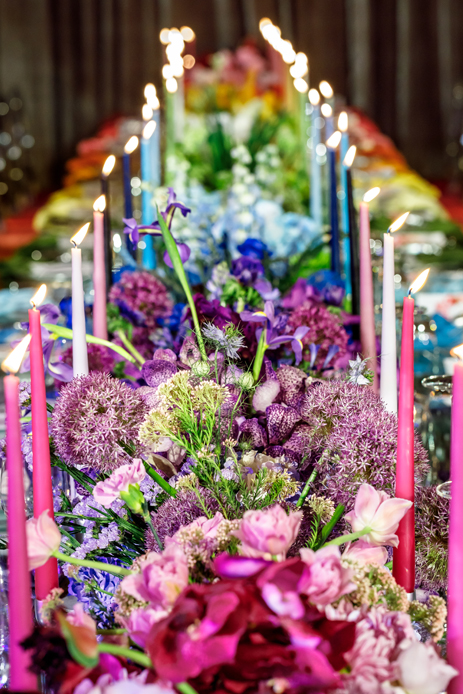 No fewer than 150 varieties of flowers were used to create the most flawless rainbow ombré gradient for a dramatic effect. Mallika says, “A set up like this entails a fair amount of precise calculations to guarantee the successful execution of the concept. While putting together the decor each variety had to be carefully curated and measured to make sure the right numbers were ordered and that the colors blended well. Some of the flowers even had to be dyed to achieve a consistent effect.”