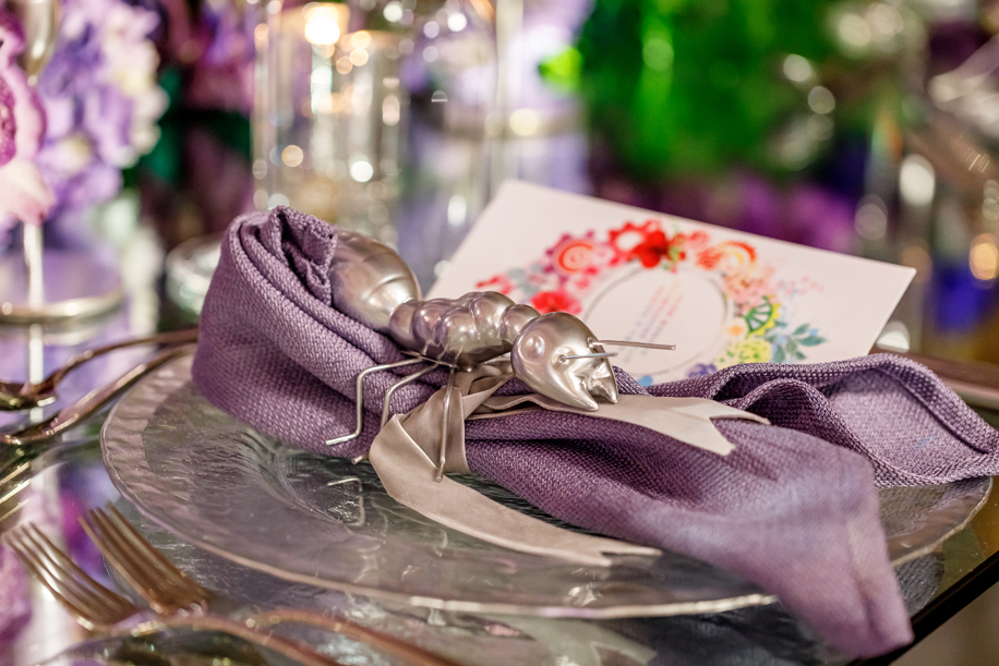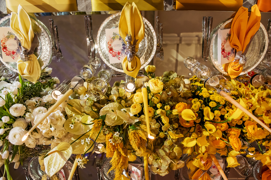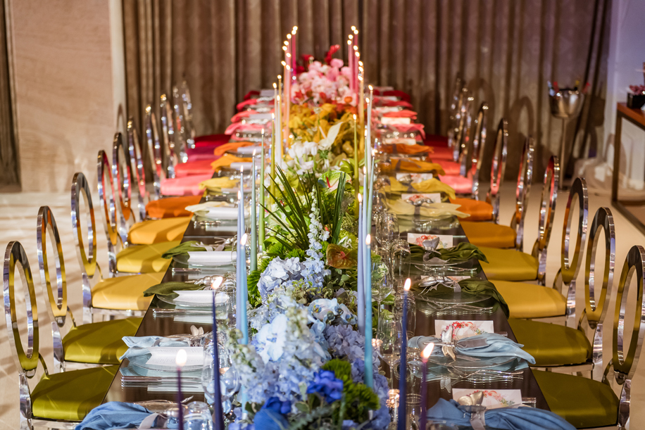 The team at Fête Events then extended the scope of the aesthetic with an ombré effect rendered via table napkins, upholstery and other aspects of the decor, all aligned with the theme to create a magical effect. Mallika explains, “The vibrant tablescapes featured long rainbow ombré runners created with flowers which were accompanied by tapered, drip-free candles sourced from Europe to match the floral varieties.” Silver accessories, customized menu cards and silver napkin holders with insect sculptures added an element of sophistication. The planner says, “All the fabrics used went through many tests to get the exact colors we needed to deliver an aesthetically dynamic and jaw-dropping setup. The matching napkins, as well as chair seats pads, looked stunning under the light of the contemporary silver chandeliers. The ambience was so wonderful, it really had us believe we’d conjured rainbows down here on earth.”