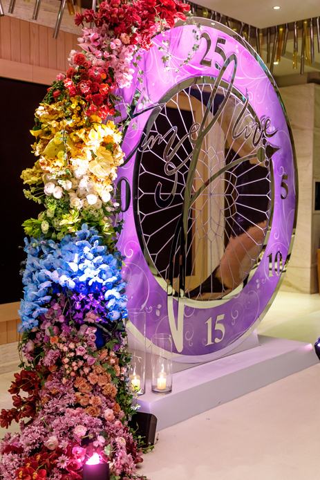 As they made their way to the venue, guests were greeted by a large clock installation that included a cascading runner made of elegant and exotic flowers. Off white carpets covered the expanse of the pre-function area and were offset by glossy cocktail tables and contemporary floral installations in tall glass vases.