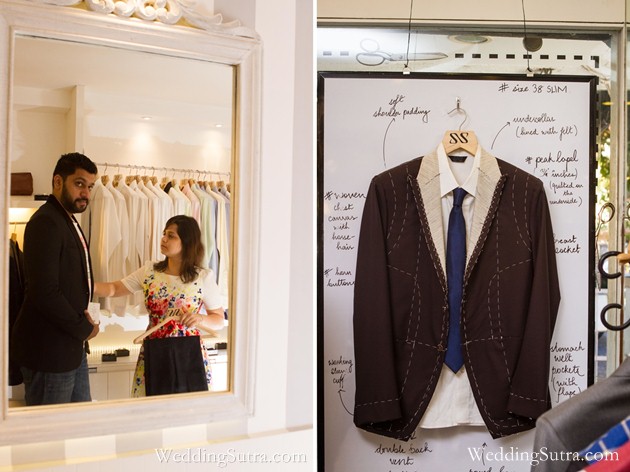 Natasha and Mark’s review: We were quite overwhelmed to know that the all-new store had offered WeddingSutra an exclusive invitation to their readers. To be one of the first visitors made the start of our day extremely exciting. As we stepped into the stunning, beautifully designed space, we received such a warm welcome from team WeddingSutra and Anita Dongre’s staff. They walked us through the bridal collection, which included incarnations of classic attire for both, the bride and groom. The Indian wedding gowns for the modern bride were particularly eye-catching and we tried on outfits to experience the structure and feel of the designs. In addition to the gorgeous bridal and groom couture, you can also choose bespoke bridal jewellery (Anita Dongre Pinkcity crafted by Jet Gems) and wedding accessories.