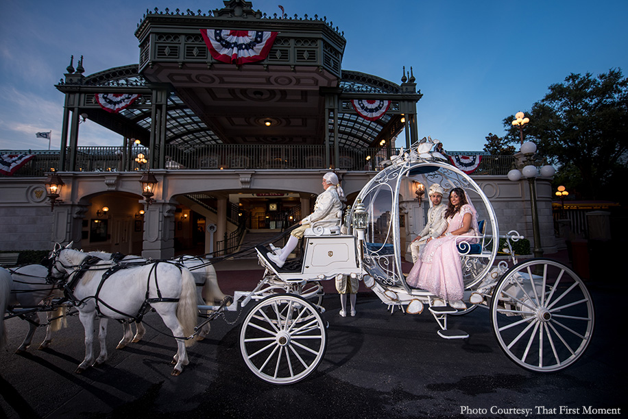 Preceded by the traditional ceremonies, a grand dinner and reception was held at Disney’s Contemporary Resort. The guests enjoyed a special Bollywood + Disney medley act by the bride and her Absolute Bollywood crew and an energetic performance by Zalon and his band. In addition, the glitz and glamour of the after-party with Dj Suhel featuring glowing furniture, dessert stations, and savory sliders were highly-popular with the guests. The couple also had a stunning portrait session at the Magic Kingdom featuring the iconic Cinderella’s Coach. Team Mpire Events worked closely with the couple to create a montage of personal experiences that blended their culture, traditions and individual interests to make their fairytale dream a reality.