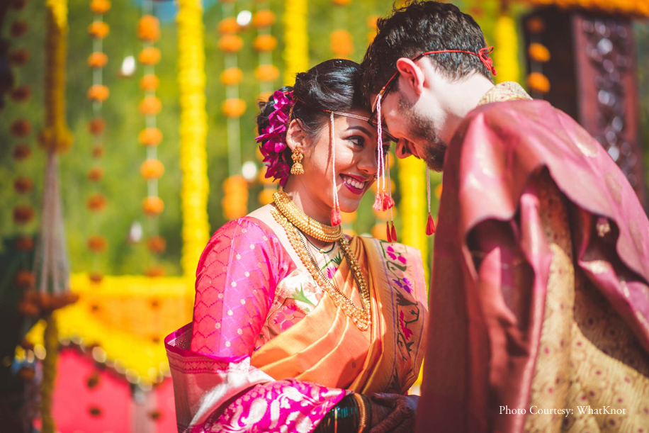 The Hindu ceremony was conducted in accordance with Maharashtrian traditions in the morning. Dressed in her Paithani saree, the bride looked radiant! A wonderful evolution of the tradition meant that the family decided to switch the usual Kanyadaan ceremony with one that celebrated a joyful union of the two families where Jo’s parents accepted Saawani as their daughter and vice versa.