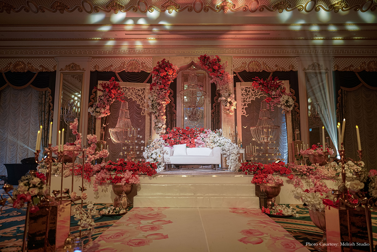 The UAE-based team of Splendid Surprise Luxury Weddings, known for its expertise in creating fabulous destination celebrations and incredible experiential wedding setups, orchestrated the evening with artistic opulence. The wedding saw an exquisite blend of Arabic and Indian-inspired decor to celebrate a union that included and honored two distinctly different cultures.