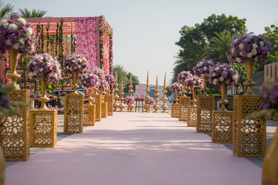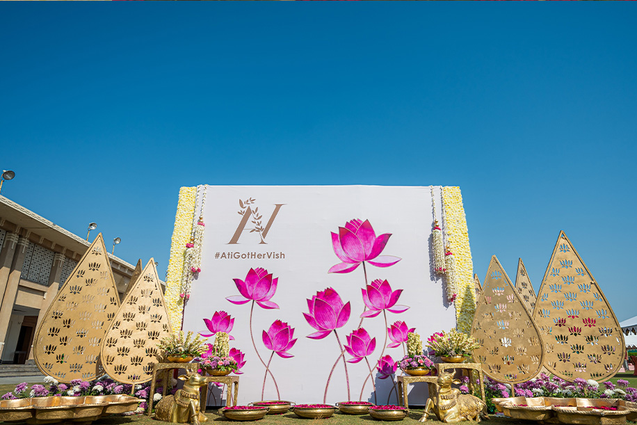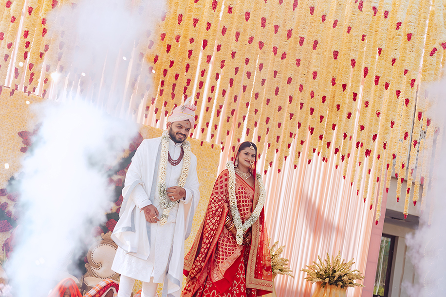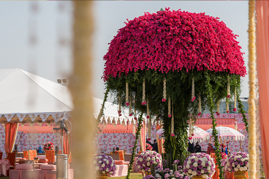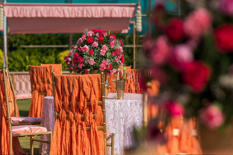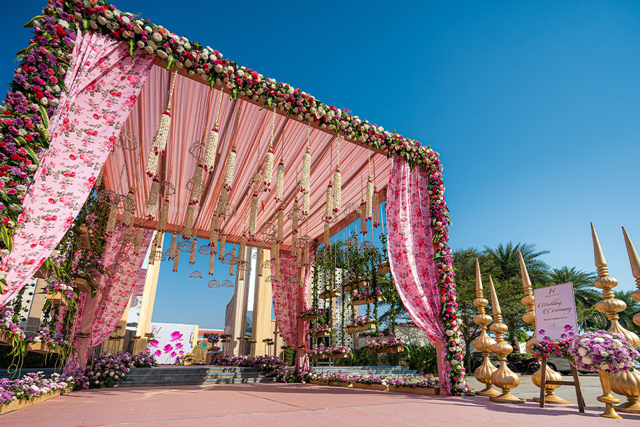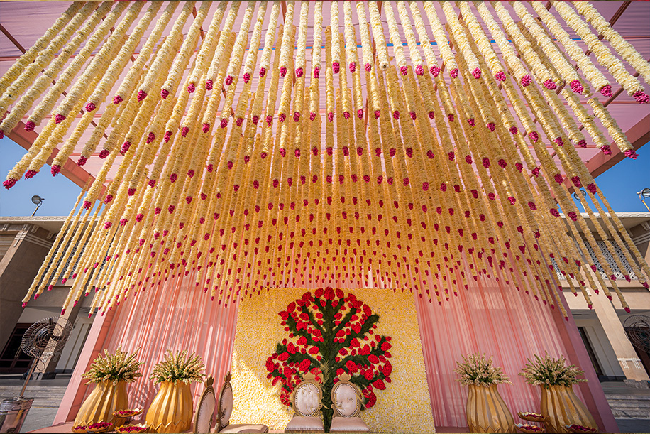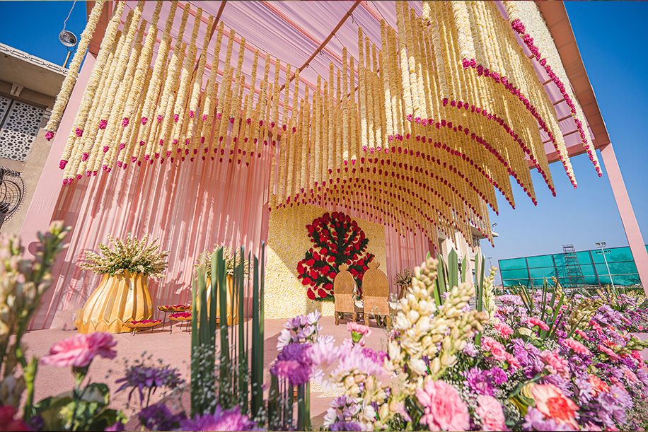 Hosted outdoors, the occasion was imbibed with a serene grace by adopting a colorful, summery color palette. Flowing drapes, floral prints, brass ornaments, and abundant fresh flowers were used to add tons of visual intrigue to the occasion. The floral canopies were made using local Indian blooms like Roses and Rajnigandha flowers, interspersed with traditional brass hangings. At the same time, unique design ideas were seen around the space, such as the woven fabric backings of the chairs. The highlight of the ceremony was undoubtedly the mandap, a breathtaking structure that saw a canopy of flowers set in cascading waves. An awe-inspiring floral backdrop designed in the image of a tree framed the happy couple, the perfect confluence of tradition and tranquility.