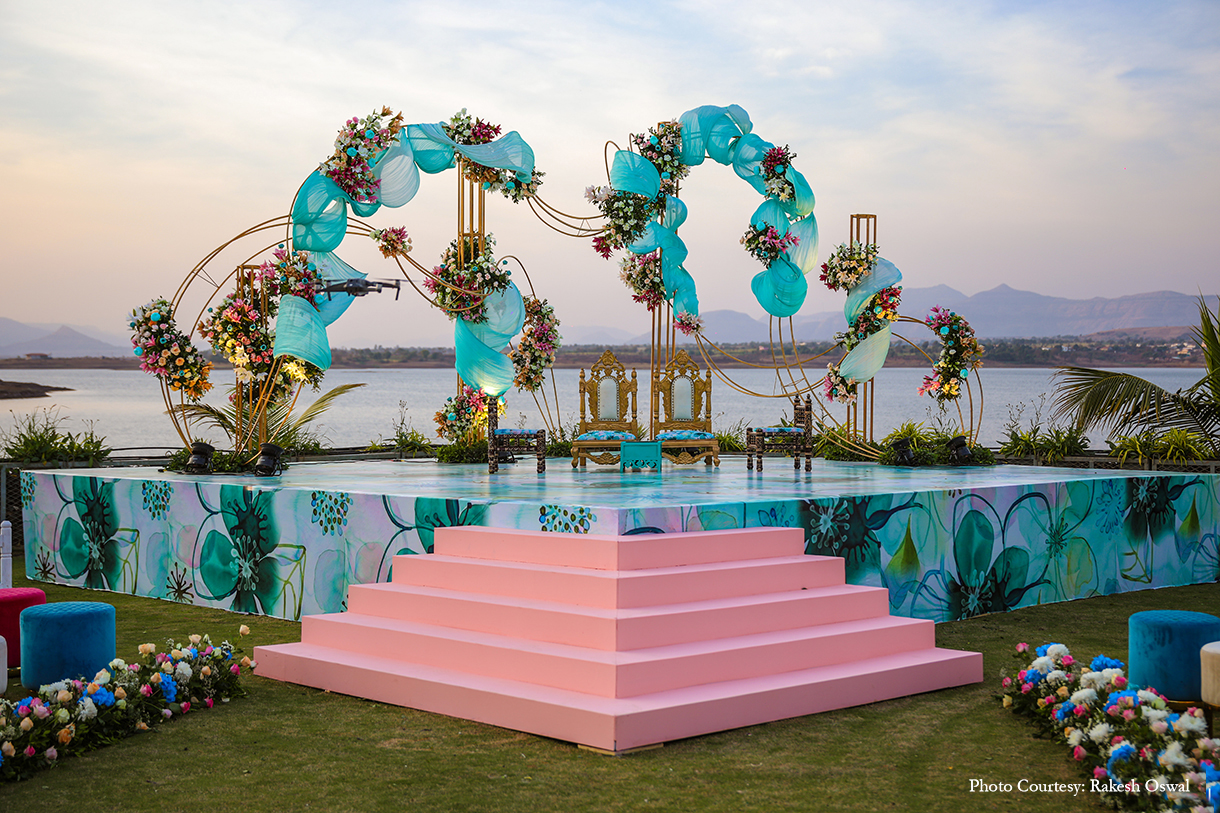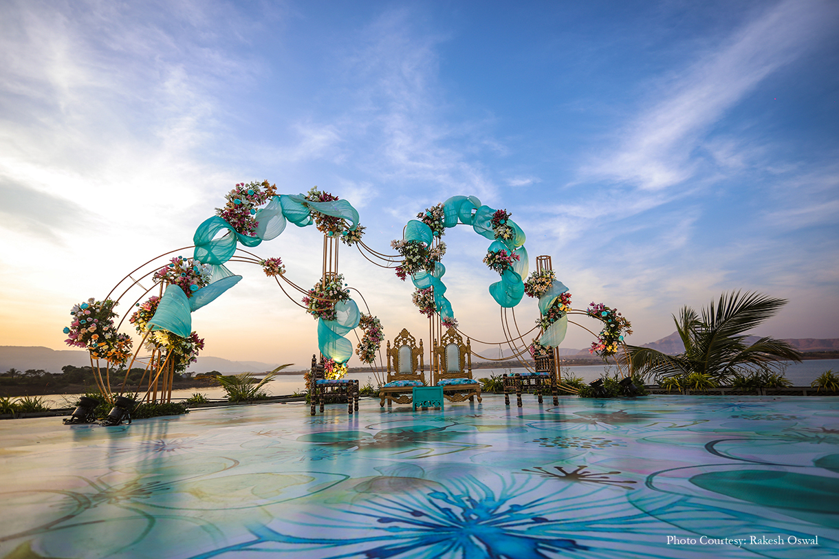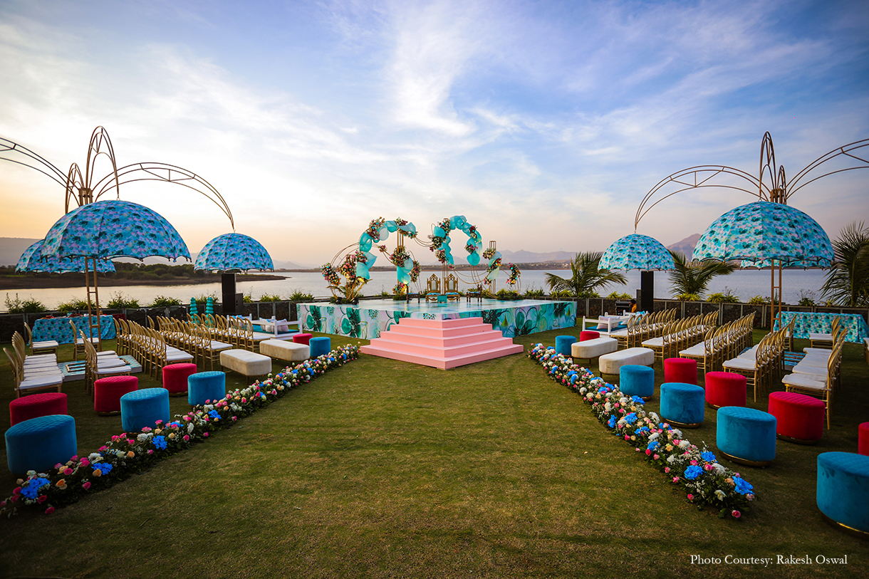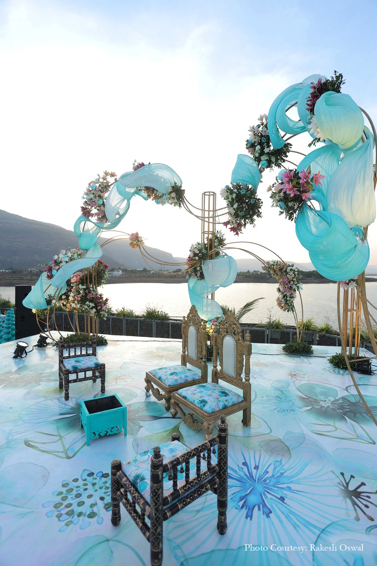 The groom’s Baraat was nothing short of a euphoric procession. Every beat, every cheer, and every step radiated excitement, making it a celebration not just of union but of joy in its purest form. Against the tranquil backdrop of a pristine lake, Jeet and Jaanvi’s wedding ceremony unfolded like a dream. The Aqua-themed décor mirrored the natural serenity of the setting, creating an atmosphere of calm reverence. A live painting captured the couple’s vows in real-time, while a soulful performance set a deeply emotional tone. Jaanvi’s bridal entry, set against this picturesque canvas, was a vision that drew collective sighs and teary smiles.