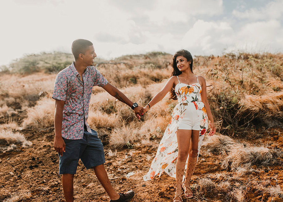 Growing up in London and located on the same street, the friendship between Pooja and Rushil was instant. And, as fate would have it, both of them realized quite early on that they were soul mates. But long distance intervened in their blissful life, as Pooja stayed in London and Rushil moved to America to expand his business. However, the unexpected proposal took place when Pooja equipped with a plan to surprise Rushil for his birthday in Orlando was bested by him instead with a romantic proposal. To put his plan in motion, he confided in Pooja about his wish to see the fourth of July fireworks in Hawaii. Pooja, all thanks to her indulgent nature, agreed wholeheartedly and off they flew. Little did Pooja know that Rushil had other plans in mind as they landed on Hawaii’s Big Island and made their way to Honolulu. Displaying his strong planning skills, he’d already booked a photographer to capture the tender moment.