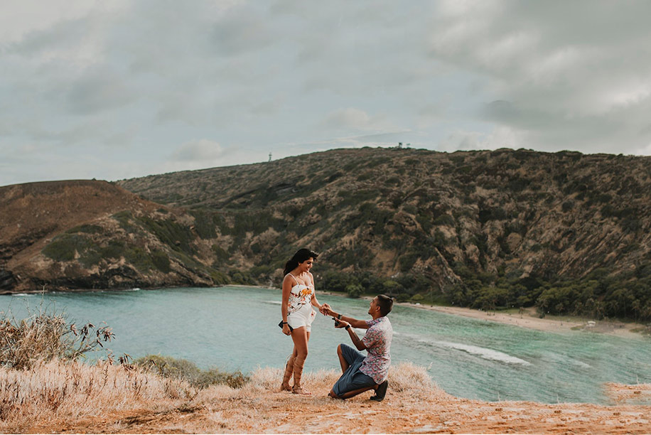 A Hawaiian wedding proposal set against the shimmering turquoise blue waters of Hanauma Bay!