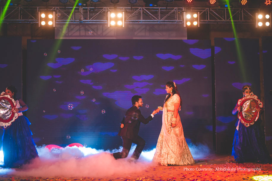 Since most of the functions of the wedding followed a colorful and traditional decor, the duo decided to glitz it up for their engagement/sangeet function. With a magnificent LED backdrop, the stage was the center of attention as each of the family members showed off their best moves. Planned seamlessly so as the bride and groom could bask in their family’s love, Sweta and Vibhu made a stunning entry heralded by violins as they witnessed awe-inspiring dance performances choreographed by Shashank Sinha. Mahashweta Mukherjee also added her unique observations into the mix and made everyone feel supremely comfortable.