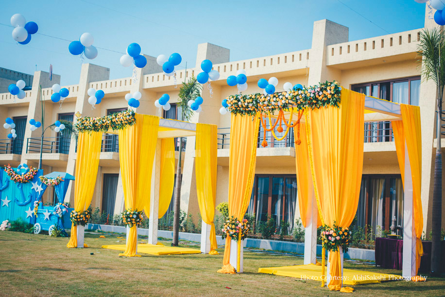 However, for the Haldi, the theme stayed traditional with it’s all yellow color palette that enchanted the guests. Entertainment flowed freely at this ceremony too with the dholwalas urging everyone to shake a merry leg on the dance floor, and the phoolon ki Holi unleashing a plethora of friendly and animated shenanigans.