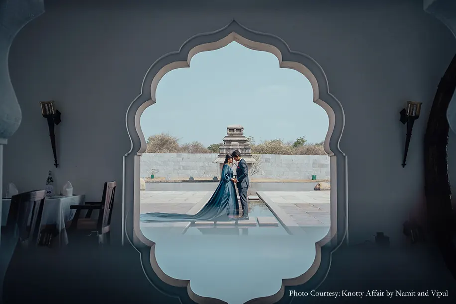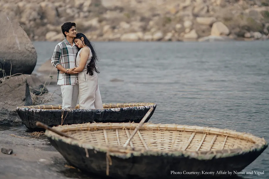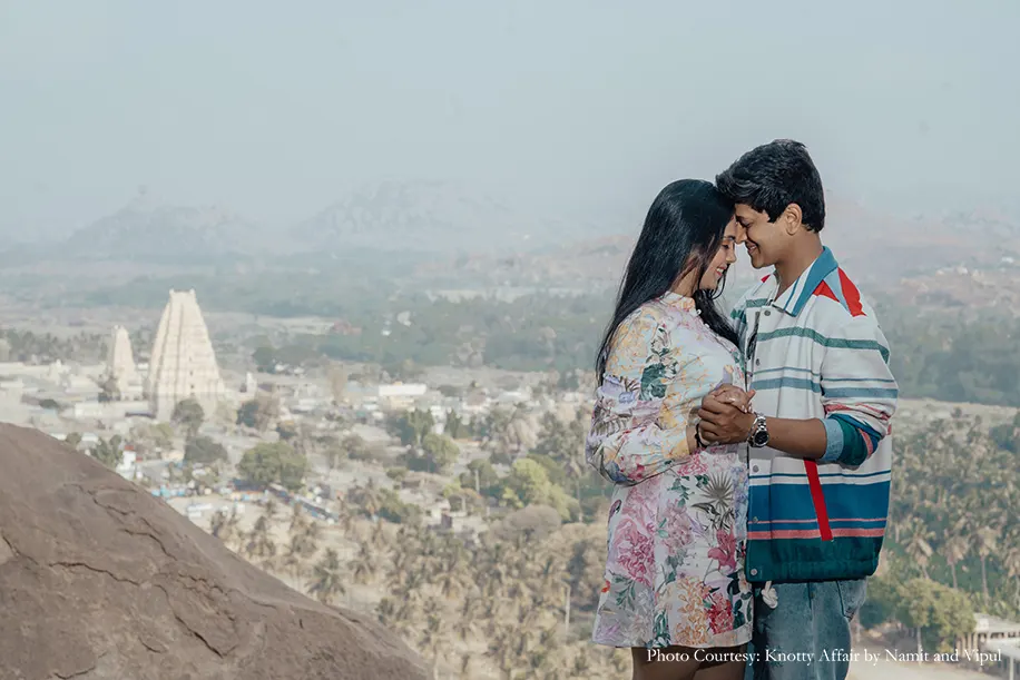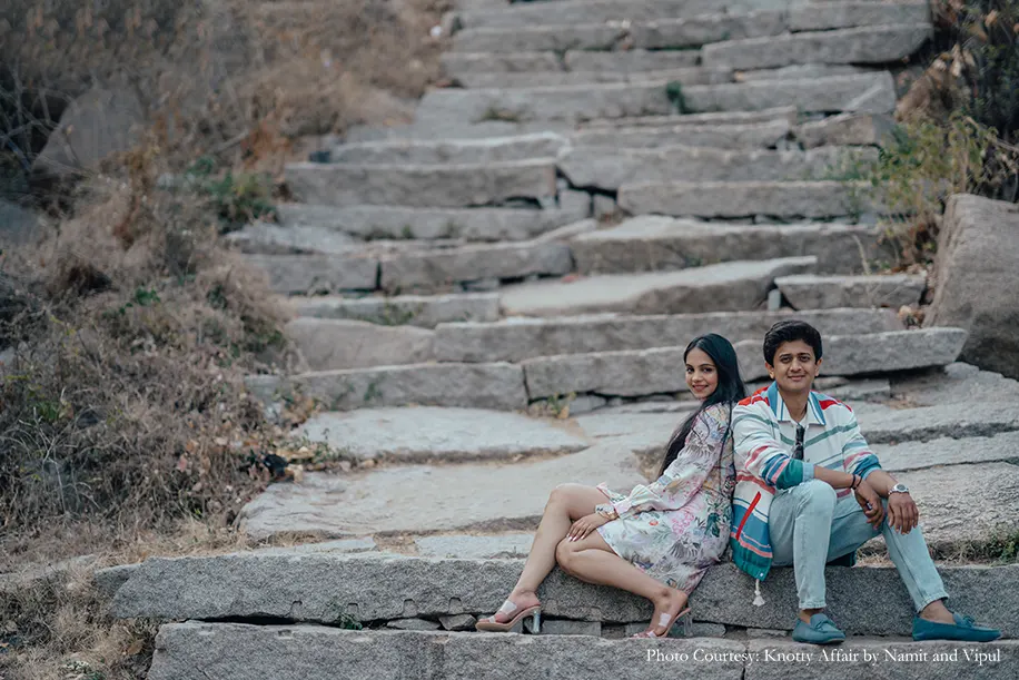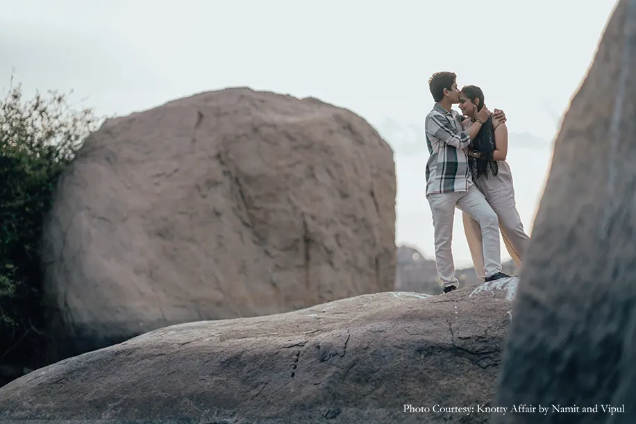 Ayushi Jain first crossed paths with businessman Akshay Bhandari way back in grade 10 as they were enrolled in the same coaching classes. After a couple of healthy flirtatious encounters, numbers were exchanged leading to endless midnight conversations that transitioned into a wholesome journey of love. The lovestruck duo was keen on a pre-wedding photoshoot just before tying the knot and they settled on the stunning locale of Hampi. Photographed by WeddingSutra Favorite – Knotty Affair by Namit & Vipul who captured every affectionate moment between the childhood sweethearts, this pre-wedding photoshoot reflected romance and playfulness.