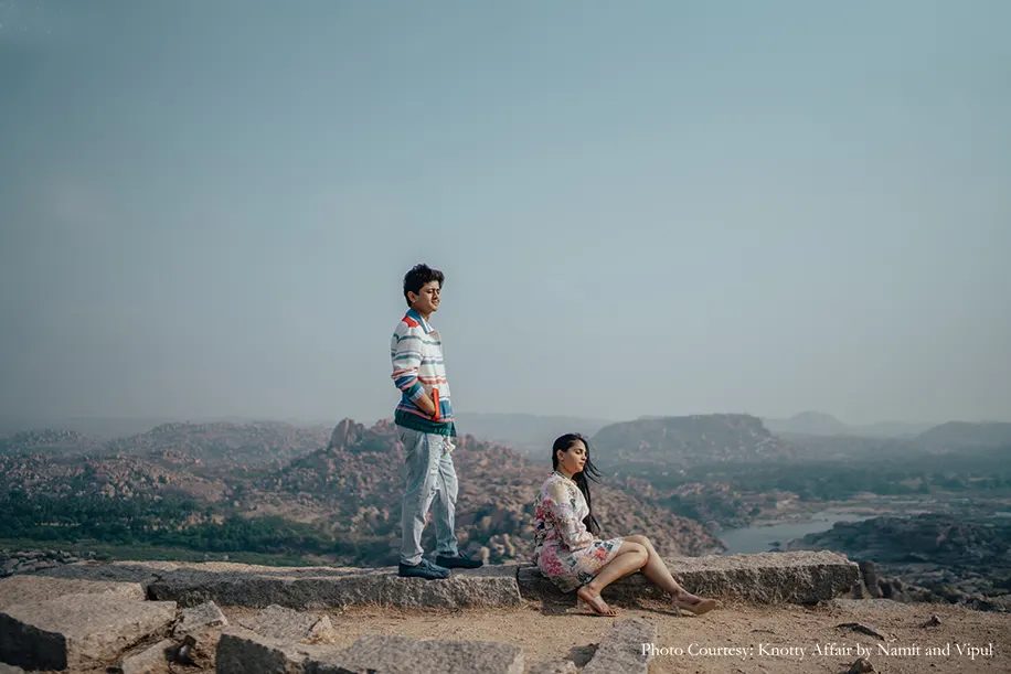 A heady combination of history and romance, this couple’s pre-wedding photoshoot was against the majestic backdrop of Hampi.