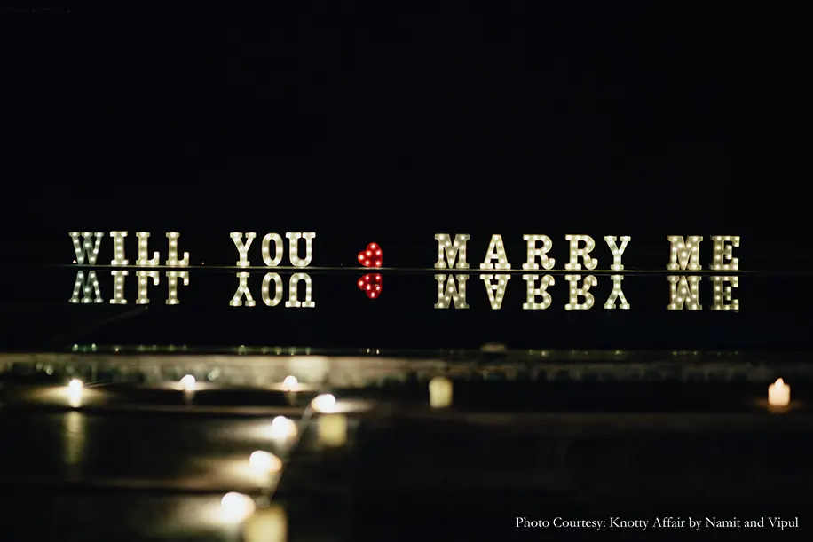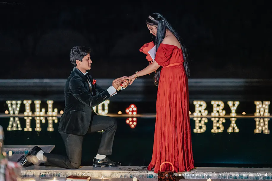 However, there was something more waiting in store for Ayushi than a pre-wedding photoshoot. Unknown to her, Akshay had planned a nostalgic surprise proposal to sweep her off her feet! Akshay shares, “The proposal was a culmination of two months of discreet planning, and fortunately it went off better than I imagined! I had put together a memory chest filled with love notes that we’d written to each other over the years, and when Ayushi headed back to her room after the photoshoot, to her pleasant surprise she found a red dress and a note asking her to join me for dinner. As she entered, I blindfolded her and we walked hand-in-hand on an aisle strewn with petals. I slowly removed her blindfold and went down on one knee and she said an excited ‘yes!’ This perfect day ended with a candlelight dinner accompanied by glasses of wine under the starry sky beside the infinity pool.”