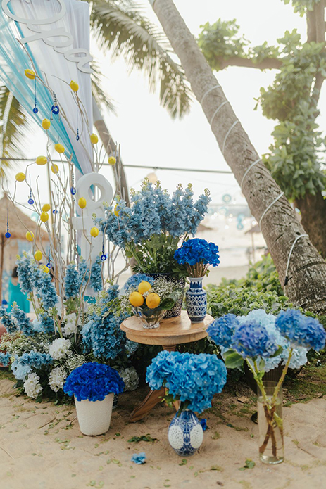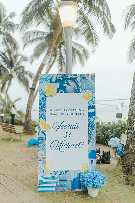 As day turned to dusk, the Greek Sundowner transported everyone to the Mediterranean. Inspired by Michale’s European heritage and their shared love for travel, the evening unfolded in hues of azure and ivory. Flowing drapes, olive branches, and the golden Goan sunset created a surreal Santorini-inspired ambience that was equal parts romantic and radiant.