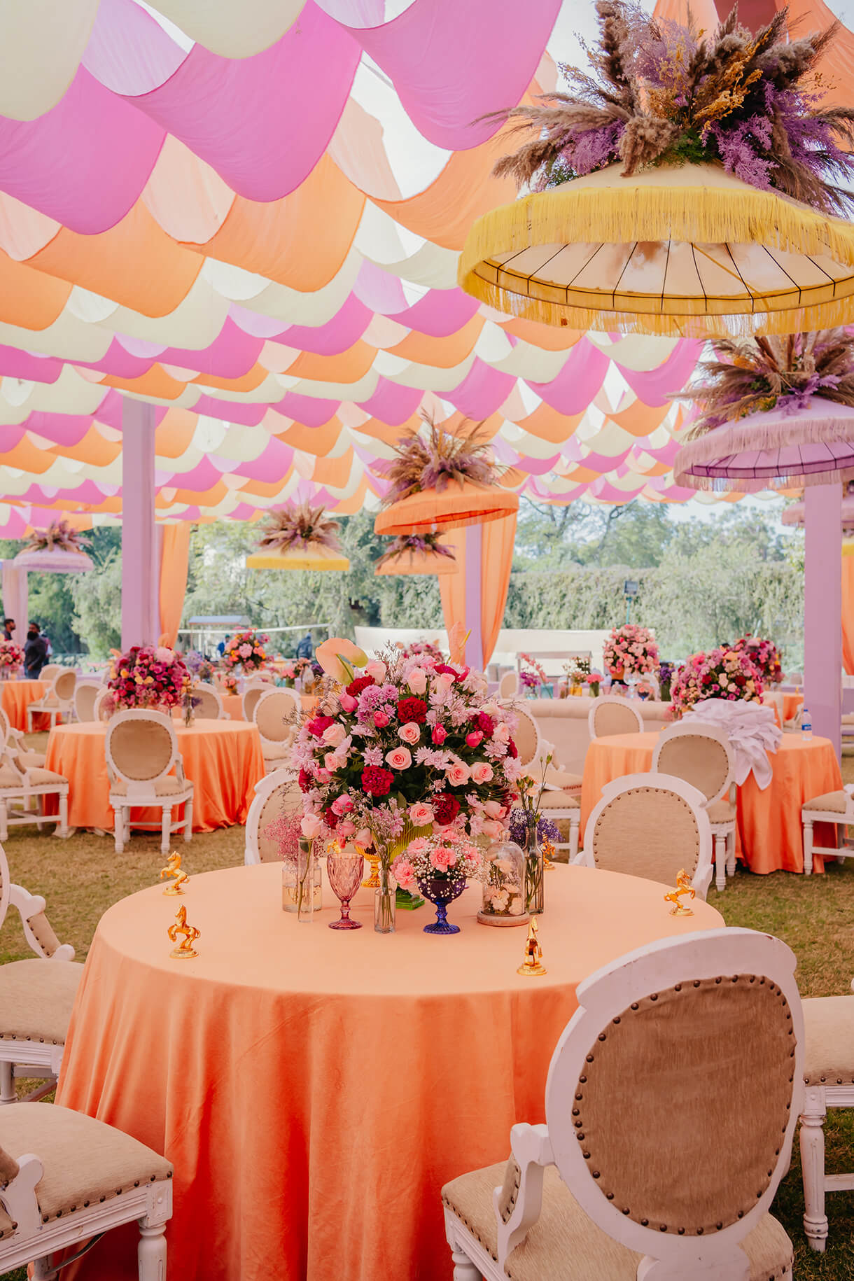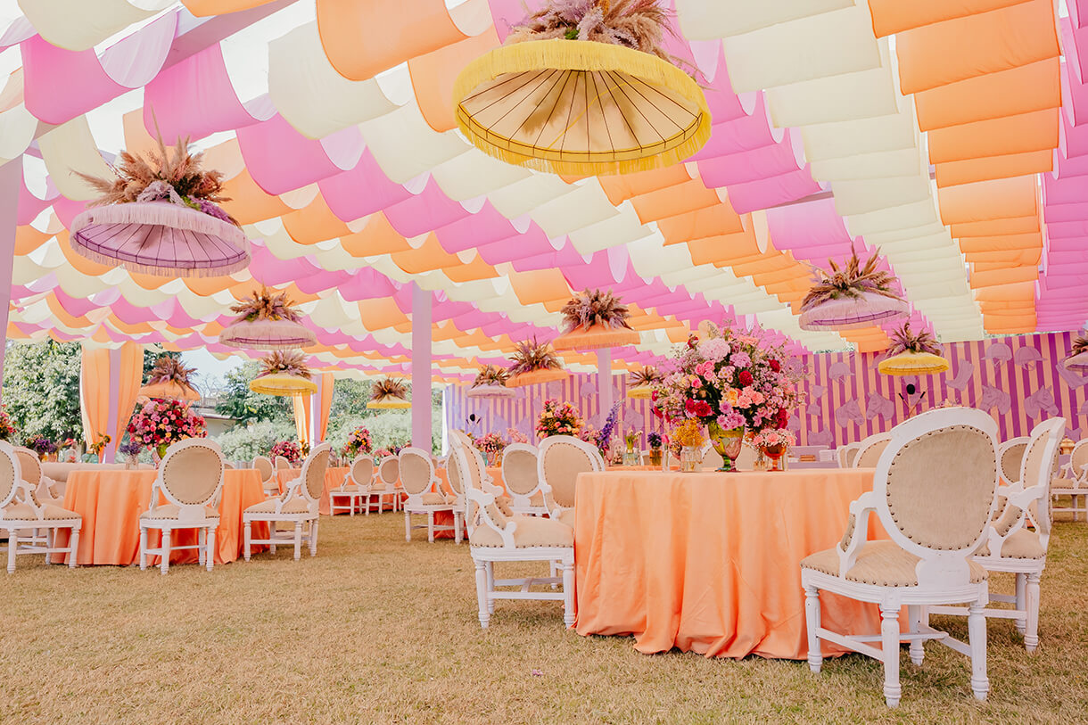 First off on the list of events preceding the wedding was a Manglik Prasang – a religious ceremony which includes offering prayers to Lord Ganesha to bless the union. Ashima Arora from Aroosi shares, “Massive Aangans of village homes, with lawns till where the eyes can see, lush mango and lemon trees, birds chirping in through the trees and occasional visits from monkeys – we wanted the venue to exude an old-world charm. The botanist was our inspiration to create an organic courtyard. A massive tree in the center with a bench-like seating around it, like an excerpt from the Panchayats. Lemons, tangerines, birds, and monkeys hanging on the trees in the quintessential Indian home style. Their presence filled the air with not only their sweet sounds but also unbridled joy and chirp! Lounges of different styles were scattered around the venue covered with rattan and straw lamps, the furniture in wooden and cane, all the prints were botanical and Ajrak, and florals were tropical mixed with fruits loved by all our forest peers!”