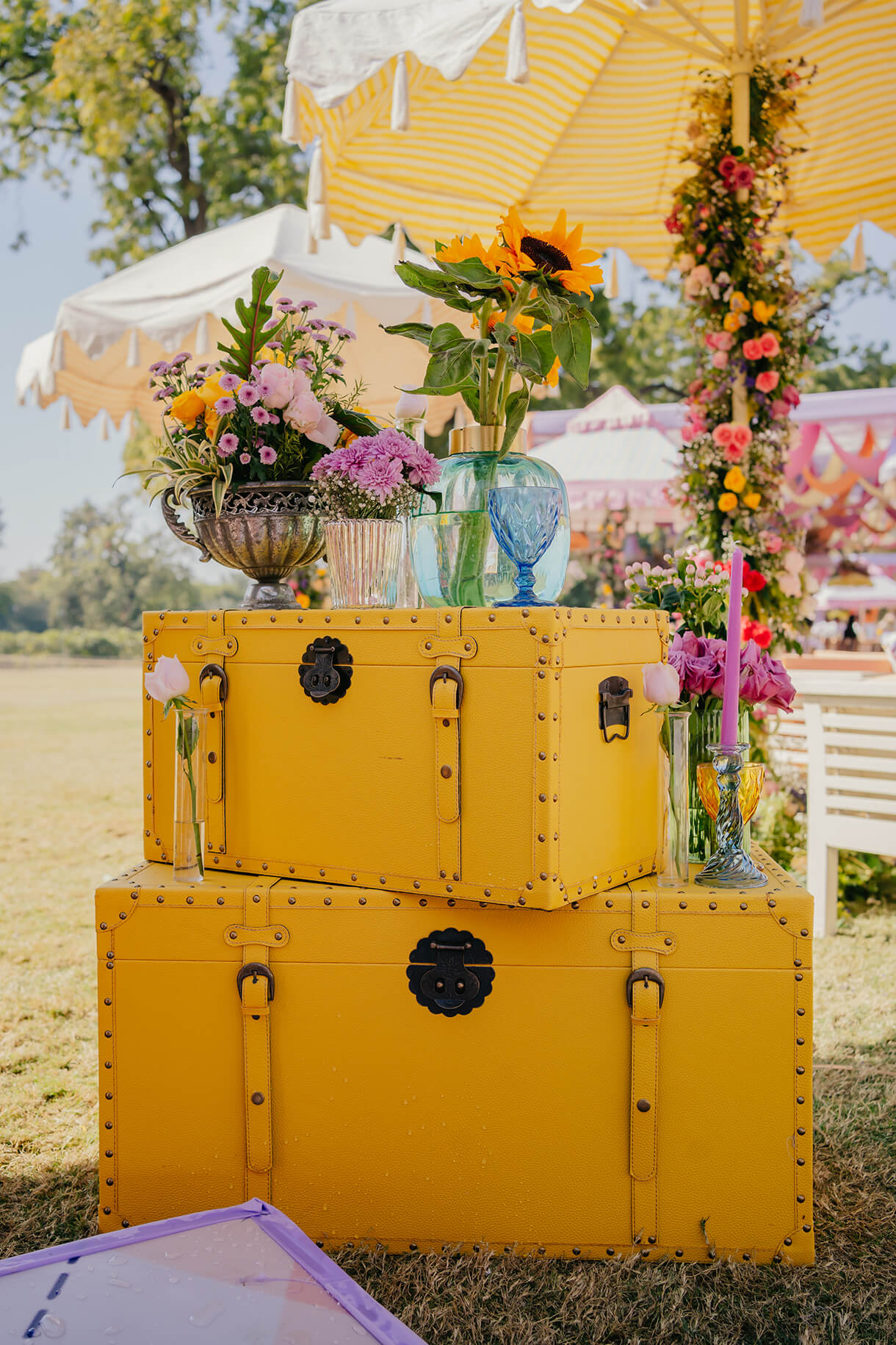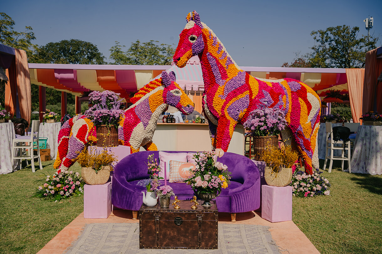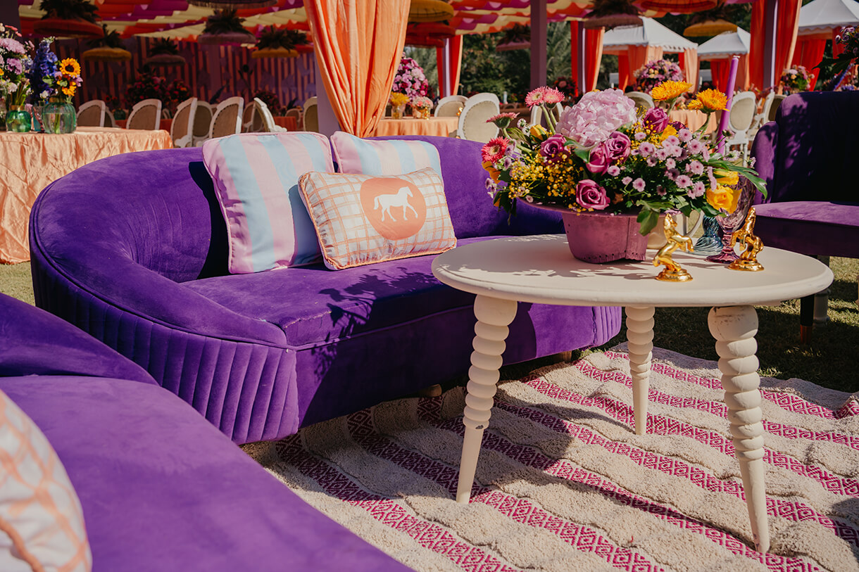 Ashima shares, “Drawing inspiration from the concept of ‘A Derby Club’, our team drew inspiration from traditional polo events but as the traditional polo events. These events usually have dark colours but as the couple loved pop colours and wanted everything bright – we incorporated bright, bold colours reminiscent of the polo uniforms and the equestrian club itself. We added elements such as polo mallets, helmets, and horseshoes into the design to create a cohesive equestrian theme. The couple’s eclectic approach left us with even more possibilities to experiment with. We took Ralph Lauren as our icon! Polo mallets hung on the walls, old saddles on wall-mounted racks dividing clothing sections. An all-encompassing style with a distinctive vision and a commitment to the highest level of craftsmanship was the aim that, we can proudly say, we achieved!”