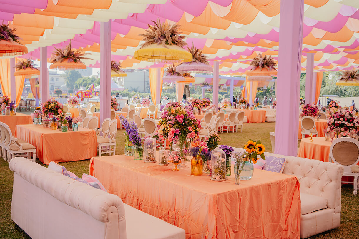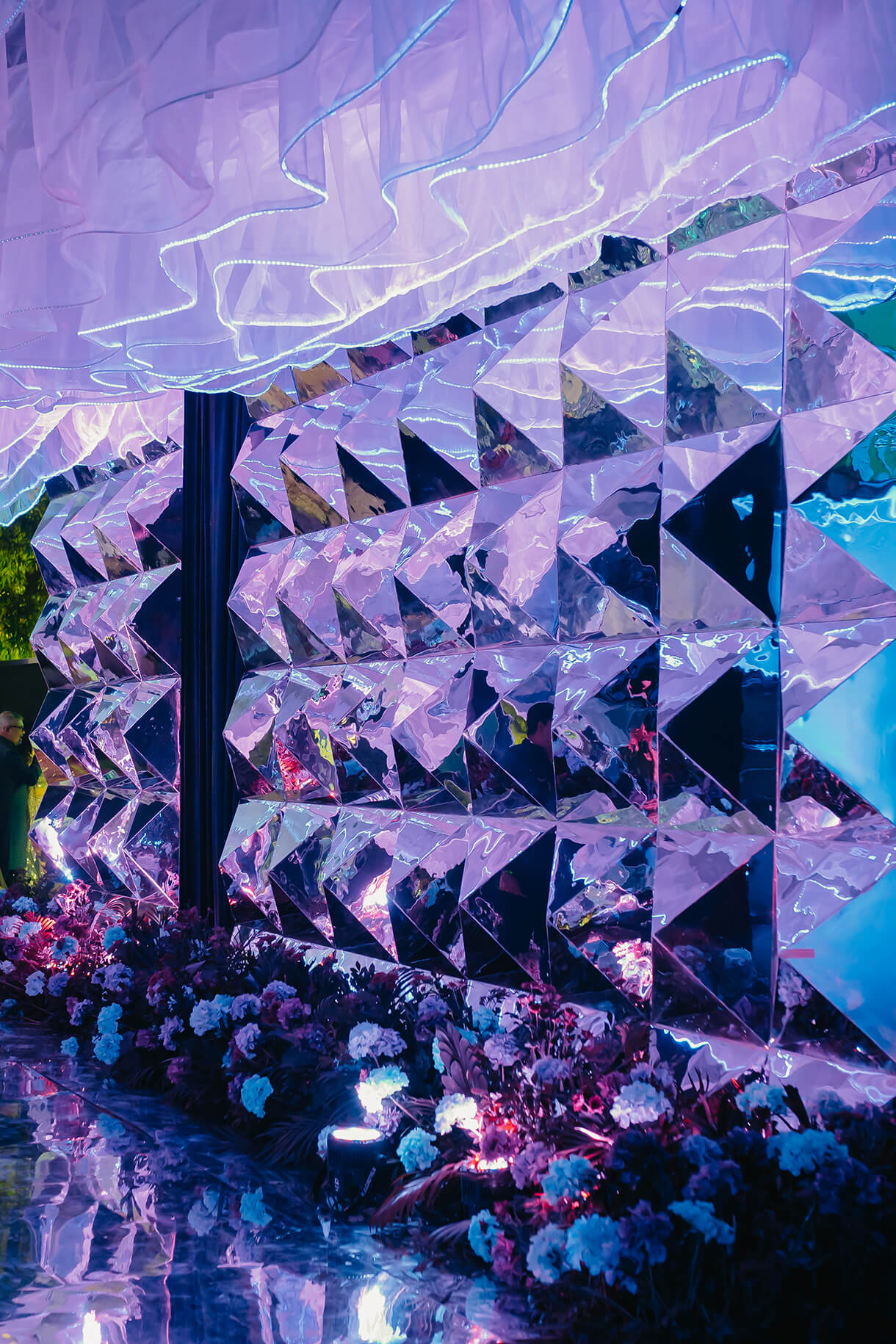 Rasmeen shares, “Malvika and Anuj first crossed paths at a chemistry lab during school. And, their chemical reaction to each other became the soul of our Sangeet theme which was ‘effervescence’. We created a colour palette that reflected the colours of a chemical reaction – light blues, pinks, and purples. We then infused this with elements of a chemistry lab.