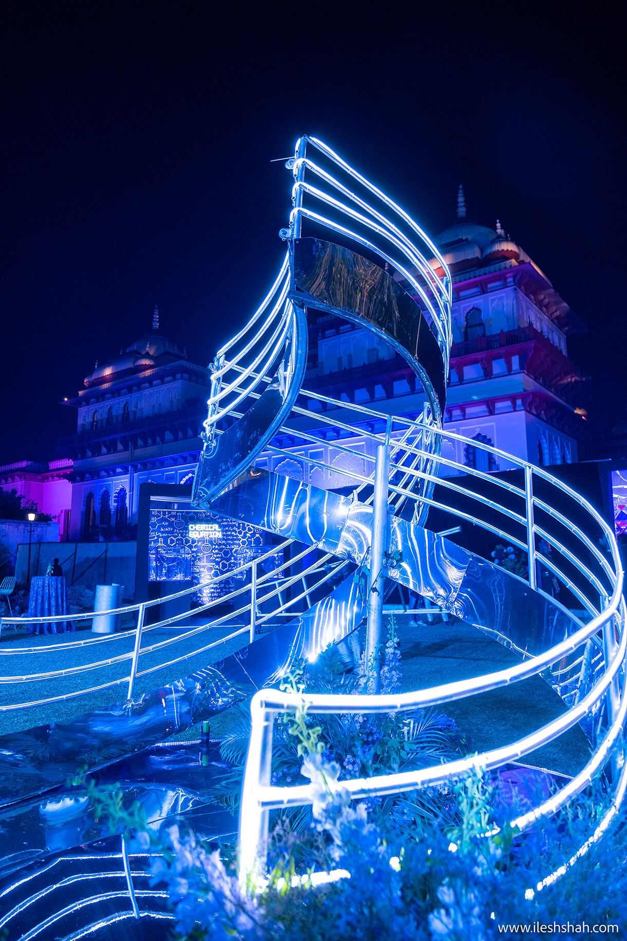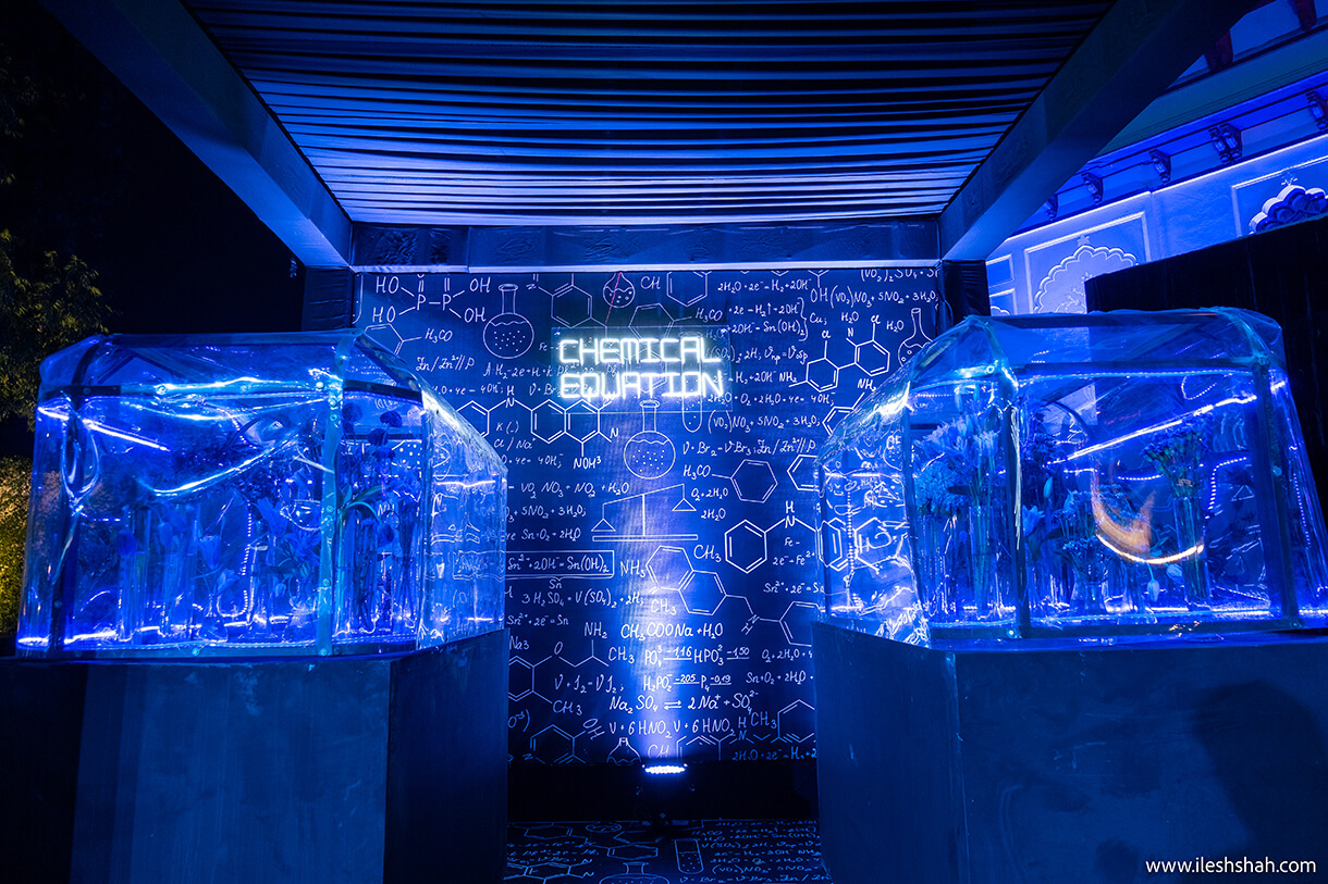 Our pièce de résistance was a magnificent circular installation suspended from the ceiling that looked like ripples from a chemical reaction. This was constructed, assembled and placed with a team of skilled artisans who meticulously and successfully suspended our showstopper from the ceiling. The ripples weren’t the only reaction happening there, a magnanimous stage with a backdrop created in layers and layers which look like fumes from chemicals burning. The centerpieces for the tables were crafted to look like bubbling test tubes, with flowers and bubbles carefully arranged to look like a chemical reaction taking place. We also used glass beakers filled with flowers and bubbles as accent pieces. The lighting was set up to create a romantic and intimate atmosphere, and the colour scheme was chosen to complement the decor.